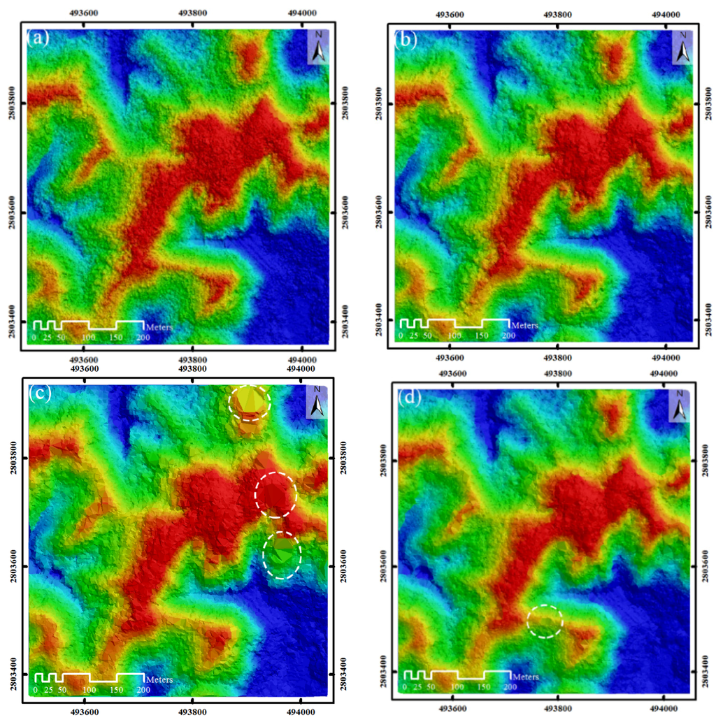 Through this strategy, instead of subsampling the point cloud before filtering, the points presenting a more detailed topography are preserved. Therefore, the rejection of terrain points can be avoided in some situations when using the same parameters. As shown in Figure 5c,d, can be successfully labeled as a terrain point in our approach using the same distance threshold between and .