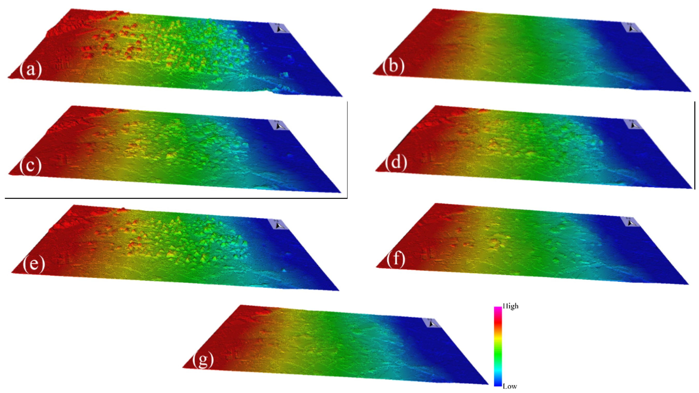 TIN surfaces constructed with the points of Site 6 and its filtering results. (a) Original stereo-matched point cloud; (b) Reference DTM obtained from manual editing; (c–g) Filtering results of PM, MC, LP, PTD and the proposed method, respectively.