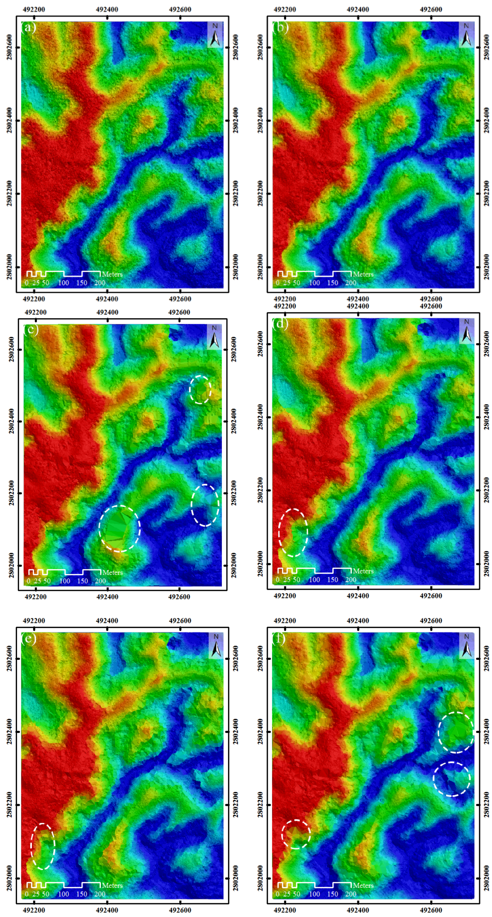 Orthographs of TIN surfaces of Site 4 and its filtering results. (a) Original stereo-matched point cloud; (b) Reference DTM obtained from manual editing; (c–g) Filtering results of PM, MC, LP, PTD and the proposed method, respectively. The white ellipses indicate the areas where the terrain points near the ridge are obviously rejected during the filtering process.