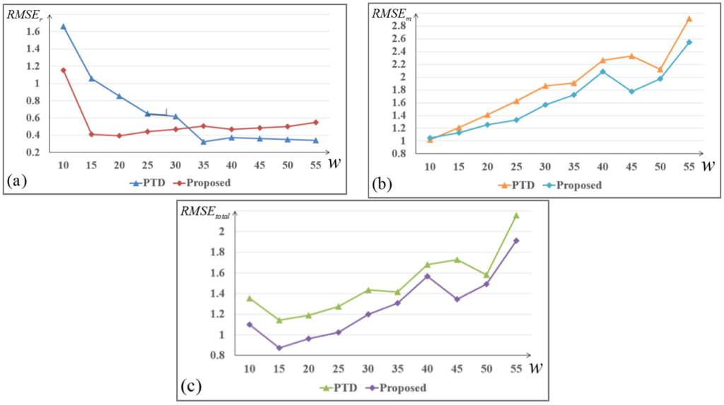 DTM accuracy values obtained by PTD and the proposed method using different values. (a–c) Comparative results of , and respectively.