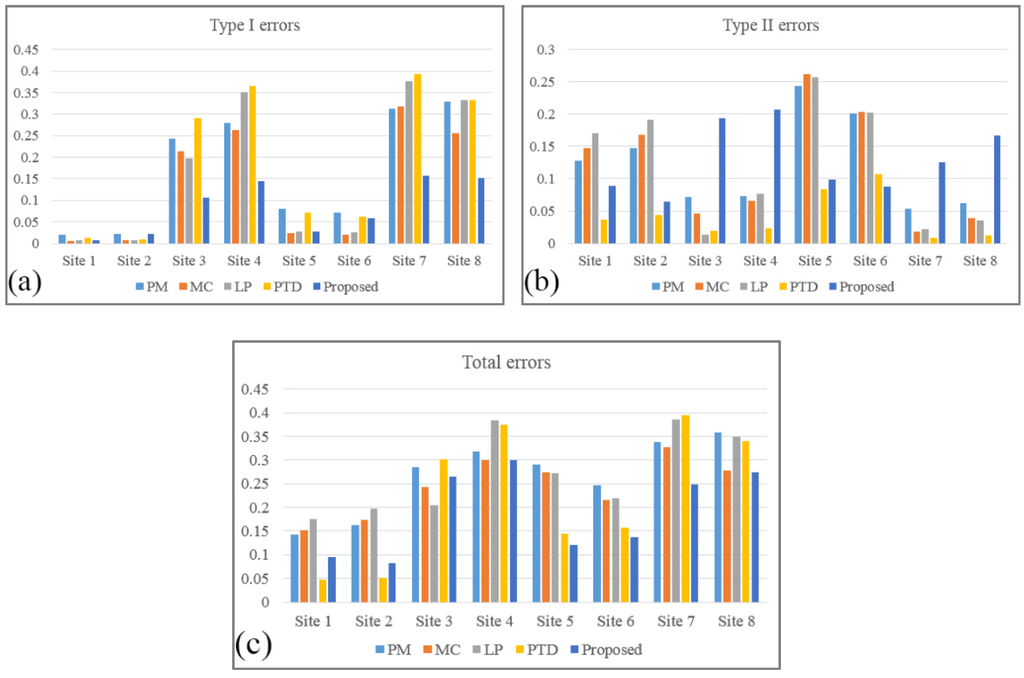 Three types of errors of the comparative filtering methods for the eight testing sites. (a–c) Type I errors, type II errors and total errors of the comparative methods for the testing sites, respectively.