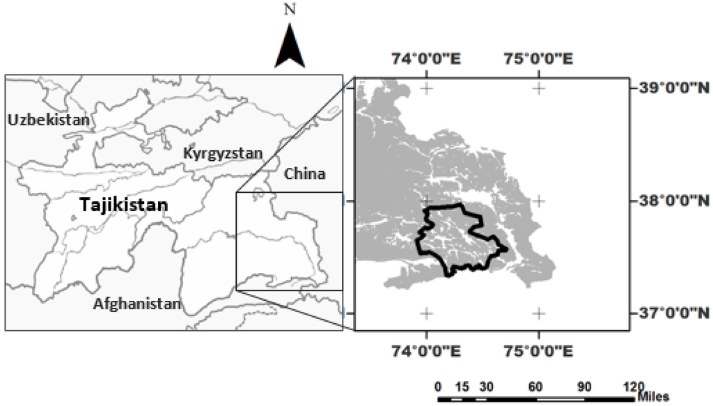 Location of the study area in the southeastern region of Tajikistan, based on a single Landsat 8 OLI scene from 15 July 2014.