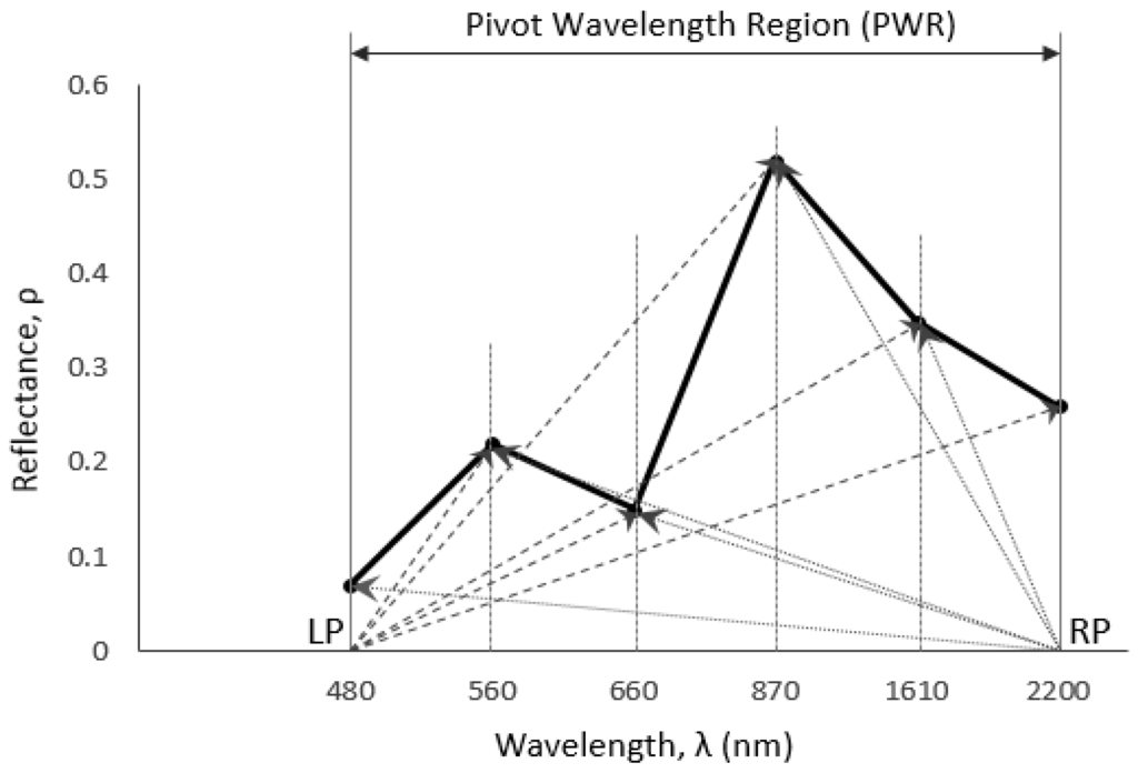The Moment Distance (Figure 3) [37] is an analytical framework that focuses on the curve structure and detects the shape of the reflectance curve. The robustness of the method in defining the curve derives from the refereed distances from two point locations designated as shorter and longer pivot wavelength region (PWR). Assume that a reflectance curve is displayed in Cartesian coordinates with the abscissa displaying the wavelength λ and the ordinate displaying the reflectance ρ. The subscript LP denotes the left pivot (located in a shorter wavelength) and subscript RP denotes the right pivot (located in a longer wavelength). The λLP and λRP are the wavelength locations observed at the left and right pivots, respectively, where left (right) indicates a shorter (longer) wavelength.