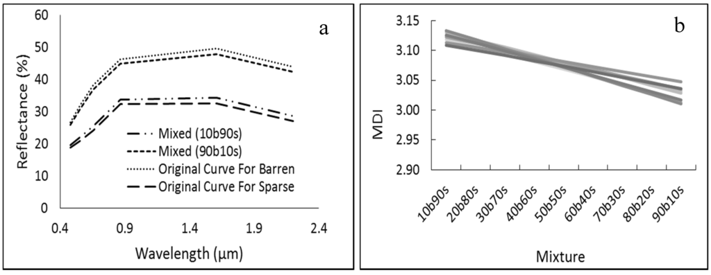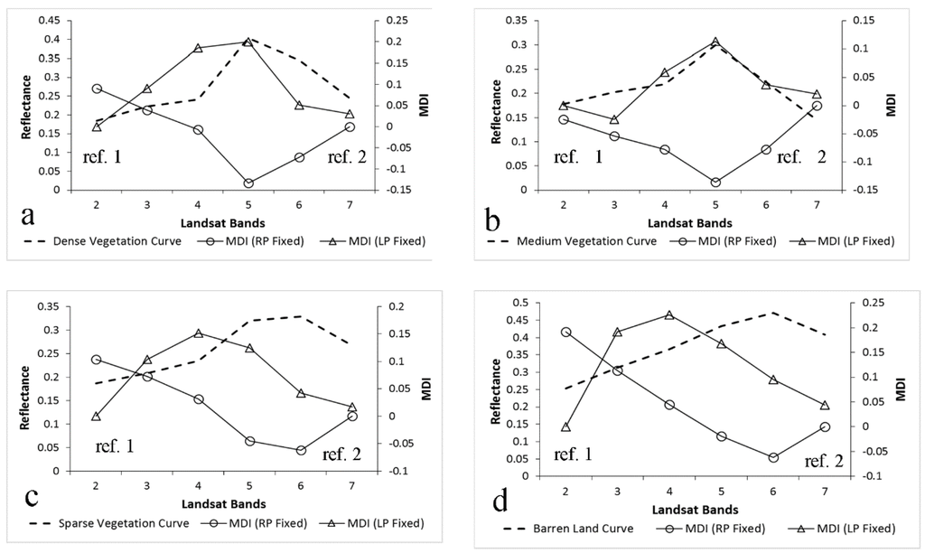 In Figure 4a,b, the reflectance curves of dense and medium dense vegetation classes are similar visually. However, MDI defines the two curves differently when considering the LP and RP. Medium dense vegetation exhibits more negative MDIs than dense vegetation, which causes the MDI (RP Fixed) to have a much broader curve opening (Figure 4b, between bands 4 and 6). The reflectance curves of sparse and barren land can also be confused (Figure 4c,d). However, MDI detects the minimal differences of the shapes of the two curves. In Figure 4c, MDI (RP fixed) has a slight upward bend when it moves from band 2 to band 5, which is caused by the presence of the dip of the reflectance between red and NIR. This bend is absent in Figure 4d, MDI (RP fixed).