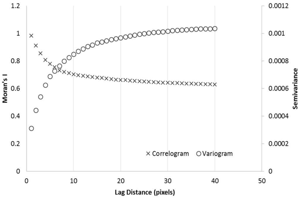 Averaged correlogram and semivariogram plots from the six bands of the 2014 Landsat image, showing the optimal lag distance (~5 pixels) with the highest variance.