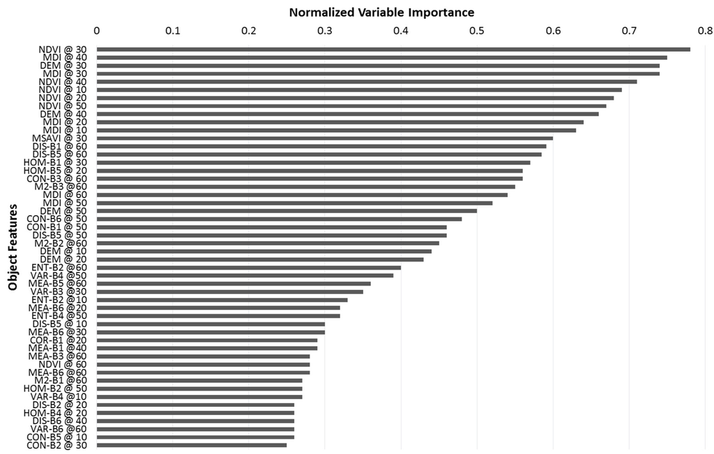 Figure 6 lists the top 50 object features according to their importance in the RF model. A high value of the normalized variable (which was based on the accuracies of the permuted out-of-bag samples, accuracies of the original samples, and the standard deviation) indicates that the variable has a high contribution for the entire RF. The input layers at the top of the list were predominantly based on spectral data, such as NDVI and MDI, with the exemption of the DEM that ranked within the top three. While multispectral information dominated the top 10, object features based on texture were located in the next 10. Dissimilarity, homogeneity, contrast, and second moment led the list of importance for texture measures. Other texture measures, such as variance, entropy, correlation, and mean, were ranked relatively lower. Topographic variables slope and aspect were both absent in the top 50.