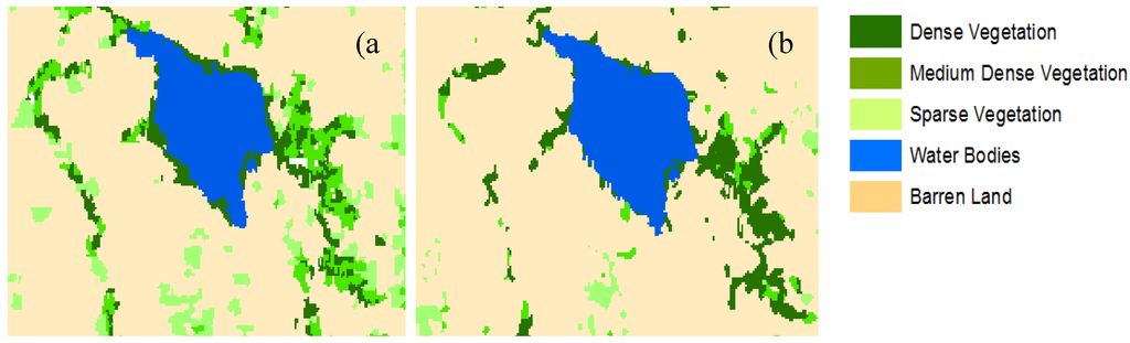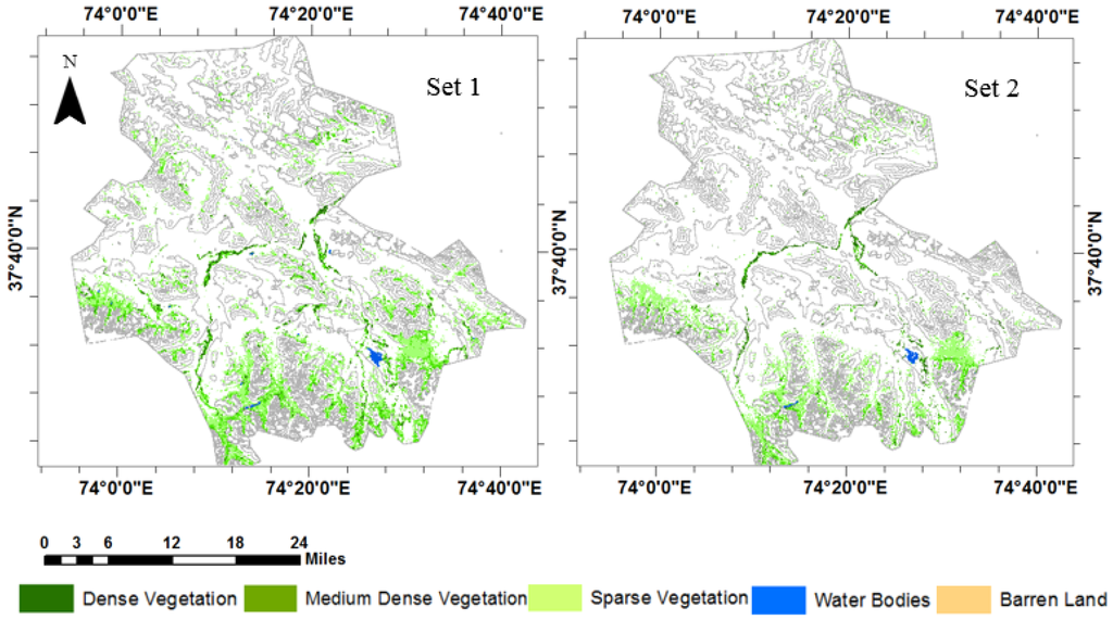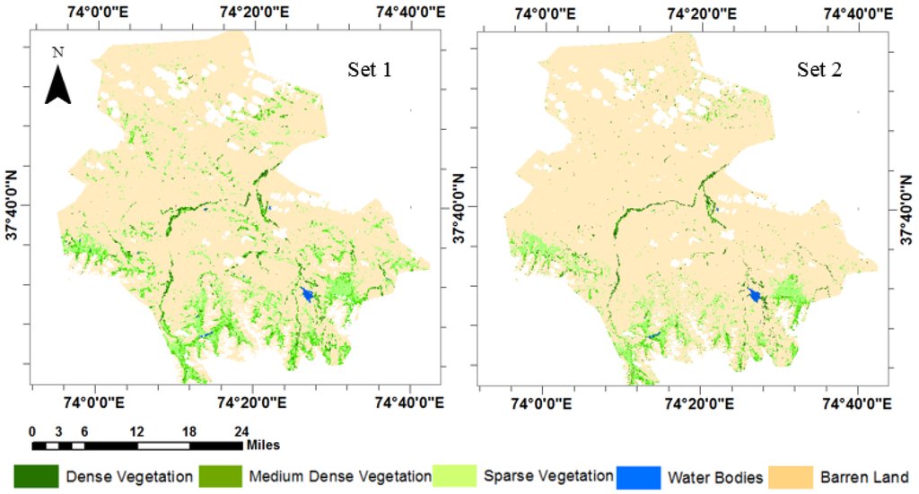 The areal estimates of the landcover classes are shown in Table 2. In Set 1 (with MDI), about 204,208 ha was covered by barren land, while a much bigger area of barren land (220,952 ha) was covered in Set 2. Dense vegetation for Set 1 has a 1.62% share (3902 ha), compared to 1.12% for Set 2 (2697 ha). Among all classes, sparse vegetation showed the most differences in area classified, a little over 20,000 ha for Set 1 and less than 10,000 ha for Set 2. The differences are reflected in the loss of sparse vegetation patches (Figure 7 Set 2 vs. Figure 7 Set 1), especially in the northern part.