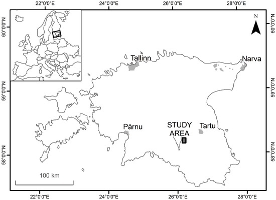 The 6 km × 9 km study area is located in Estonia, in Rannu parish (261310E, 581417N), see Figure 1. The area is relatively flat and is predominantly used for agriculture. In total, 37 agricultural grasslands used to grow red clover (Trifolium pratense subsp. sativum), alfalfa (Medicago sativa), timothy-grass (Phleum pratense), meadow fescue (Festuca pratensis), red fescue (Festuca rubra), and other species were used in the experiment. Six grasslands (further as G1 through G6) were monitored from May to September 2015 on a weekly basis, providing information about the vegetation height, wet and dry above-ground biomass, and soil moisture. The measurements were done using the transect method. Ten measurements were taken on a straight line every 25 m. Vegetation height was measured with a measuring tape, and the recorded value represents the height of the majority of vegetation interpreted visually by the field worker. Soil moisture in the upper 5 cm layer was measured using two hand-held conductivity probes: Delta-T ML2x and Extech MO750. All vegetation inside a 0.5 m × 0.5 m square was cut and collected. The vegetation was weighed to measure the wet above-ground biomass. It was then dried and weighed again to provide the dry above-ground biomass.