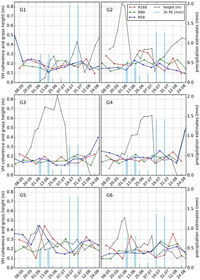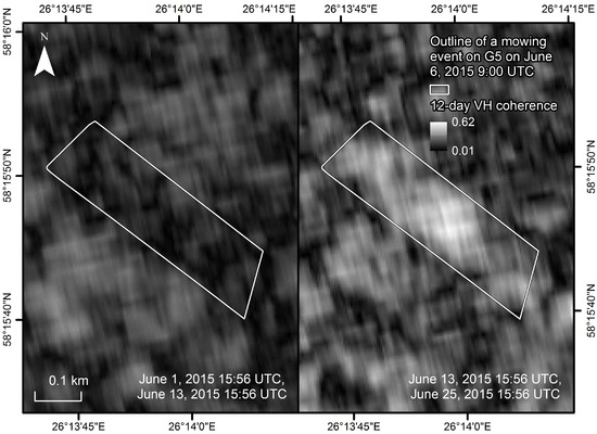 In the presence of vegetation, coherence values were also rather varied. However, some changes were apparent, and could be linked to mowing events. For example, R160 increased from 0.15 to 0.47 for G5 after a mowing event on 6 June. Figure 4 illustrates the increase of coherence after this event. To a lesser extent, increased from 0.18 to 0.34 for the same grassland after an event on 3 August. For the same events, R58 changed from 0.16 to 0.27 and from 0.24 to 0.38. The increase of coherence was mostly not so apparent for other grasslands that were inspected weekly. In the case of G6, the responses to an event in 8 June and 9 June were weak: R160 increased from 0.15 to 0.23 and R58 from 0.19 to 0.22. Response from R58 was probably influenced by rain—the 3-h precipitation estimate before the 18 June acquisition was 0.5 mm. The second mowing on 17 July was followed by a slight increase in R160 and R58 . The R160 value, however, might have been decreased by precipitation, as the 3-h precipitation estimate before the 21 July acquisition was 1.3 mm. R80’s value also increased, from 0.14 to 0.27 for G4 after an event in mid July, while R160 coherence was severely influenced by rain.