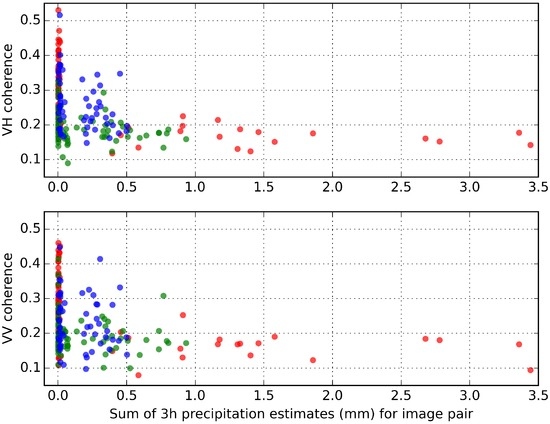 Scatterplot of coherence values and the sum of 3-h precipitation estimates at 300 m × 300 m spatial resolution based on weather radar data for the first image pair available within 12 days after a mowing event. R160 is represented by red, R80 by green, and R58 by blue dots.