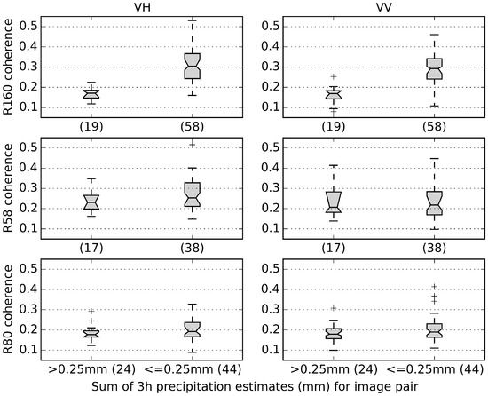 The relationship of coherence and 3-h precipitation estimates for the first image pair after a mowing event is shown in Figure 5. When precipitation estimates were over 0.25 mm, and remained under 0.25 after a mowing event with a few exceptions, and had slightly higher values than . For further analysis, coherence values were divided into groups with 3-h precipitation estimates ≤0.25 mm and >0.25 mm. A threshold of 0.25 mm was chosen because it allowed all three image acquisition geometries to be divided into two groups based on 3-h precipitation estimate values, and these two groups can likely be associated with rain and rain-free conditions on the grasslands. Figure 6 shows that the medians of R160 VH and VV coherence in these two groups differ significantly. Precipitation up to 3-h before one or both of the image acquisitions changes the structure and dielectric constant of the vegetation on grassland, remarkably decreasing the coherence. Loss of coherence due to precipitation has also been reported by Zalite et al. [27] and Ahmed et al. [42]. At the same time, R58 and R80 geometries did not show any significant differences—the notches around the median that represent 95% confidence intervals are overlapping. The 3-h precipitation estimate values were quite small before R80 and R58 acquisitions, and they might not have significantly affected the coherence. Additionally, the accuracy of the precipitation estimates has to be considered, as well as the small sample size. For R80, the median VH and VV coherence values were lower than 0.2 for the precipitation estimates ≤0.25 mm groups, so the drop of coherence could not be large for the precipitation estimates >0.25 mm group. The differences between VV and VH for this analysis were not significant.