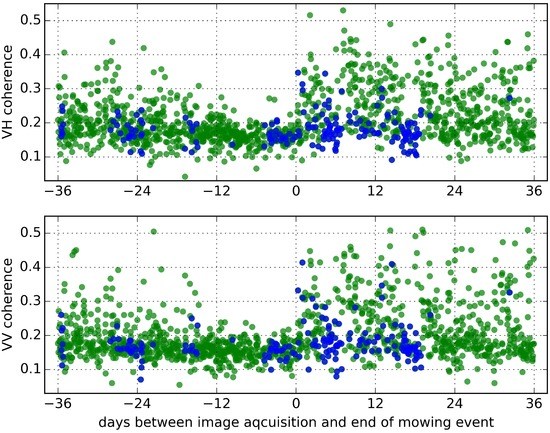 As in the case of optical remote sensing, investigations of SAR signal attributes in relation to vegetation parameters have been widespread since the first data became available, and research covers different agricultural applications and technical approaches. The launch of Sentinel-1A and -1B SAR satellites now offers an opportunity to investigate agricultural monitoring methods based on regular dense time series of free and open data. Regarding the monitoring of management practices, studies have shown the potential of approaches based on the analysis of backscatter intensities, polarimetric SAR (PolSAR), and interferometric SAR (InSAR). The possibility of detecting harvesting events of sugarcane using backscatter intensities of TerraSAR-X, ASAR/ENVISAT, and PALSAR/ALOS sensors was analysed by Baghdadi et al. [16], who concluded that the events can be detected if the acquisition date is close to the harvesting date and the sugarcane is not dried out before harvesting. In [17], the Radarsat-2 C-band HH/VV (horizontal transmit, horizontal receive/vertical transmit, vertical receive) intensity ratio was shown to be related to the ploughing of winter wheat, but management practices like grazing, mowing, and mixed management on grasslands could not be discriminated. Wang, Ge, and Li [18] analysed the relationship of COSMO-SkyMed X-band, ENVISAT ASAR, and ALOS PALSAR backscatter values to the Normalized Differential Vegetation Index (NDVI), Normalized Difference Water Index (NDWI), and soil moisture index (MI) values without ground truth measurements, and concluded that at paddock scale, X-band HH backscatter could be useful for the detection of grazing or mowing activities on pastures during peak season on non-rainy dates. Mowing events on grasslands were specifically studied using PolSAR by Voormansik et al. in 2013 [19] and 2016 [20], demonstrating that several C-band and X-band polarimetric parameters are sensitive to mowing events in cases where the grass was left on the ground after the event. However, the combination of VV and VH (vertical transmit, horizontal receive) polarized channels offered by the Sentinel-1 means that the PolSAR approach is problematic, as most of the PolSAR methods require fully polarimetric or dual polarimetric co-pol data. Additionally, use of backscatter from one channel (e.g., VV) is problematic, due to variations caused by changing meteorological conditions and vegetation orientation effects [21].