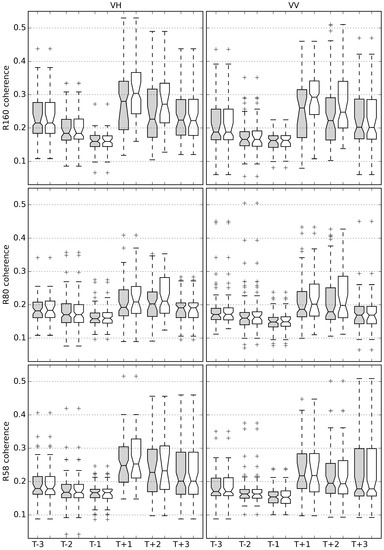 Taking into account all three image acquisition geometries, precipitation filtering affected the T, T, and T groups more than the T, T, and T groups. For T, T, and T, the average difference in medians between filtered and unfiltered data was under 0.10%. At the same time, the average difference for T, T, and T groups was 4.9%. High vegetation decorrelates both in dry and wet conditions; thus, the removal of events with precipitation has little effect for T, T, and T groups. The median values of precipitation filtered and unfiltered groups were not statistically significantly different. The influence of precipitation filtering on separation between T and T/T/T can be evaluated from Table 4 and Table 5, where the coherence values after filtering are given in parenthesis.