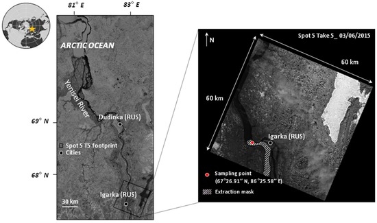 Field campaigns were conducted in Igarka, northern Siberia, ~300 km from the basin’s outlet. These campaigns were conducted for two years, from February to September in 2014 and 2015, with the highest temporal resolution during the open-water season (approximately every eight days from May to September), including the freshet period (a few weeks in May and June). Overall, 28 field samples were available in 2014 and 41 in 2015 and were carried out always at the same point in the middle of the river to avoid contamination from the underlying soil and vegetation near the reaches (Figure 1, e.g., 67°26.91′′N ± 00°01′′00–86°25, 58′′E ± 00°01′′00). In 2015, the sampling frequency was increased, and measurements were synchronized with SPOT5 Take5 acquisitions (i.e., on the same day in the morning) every five days from 9 April 2015 to 6 September 2015. From mid-May to the start of July, the field sampling frequency was almost daily.