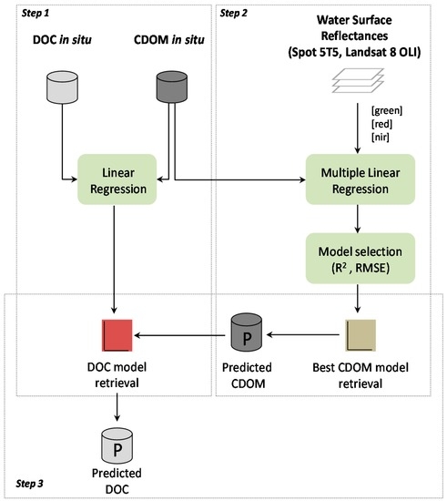 Methodological flowchart illustrating the general procedure to retrieve DOC concentrations. The Step 1 corresponds to the computation of the DOC model retrieval and the Step 2 indicates the procedure used to predict CDOM values. The Step 3 shows how the DOC model retrieval is finally used to predict DOC concentrations.