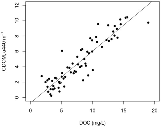 Field-collected CDOM (a440, m−1, N = 69) measurements were used as the dependent variable in a linear regression against the DOC measurements (mg/L) to estimate the relationships of CDOM/DOC in the Yenisei River.