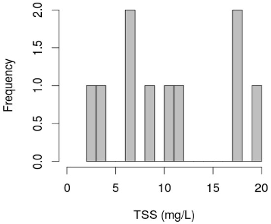 Frequency distribution of TSS (mg/L) concentrations. Two groups of field sample were distinguished: low or moderate TSS concentrations (TSS < 15 mg/L) and high TSS concentrations (TSS > 15 mg/L).