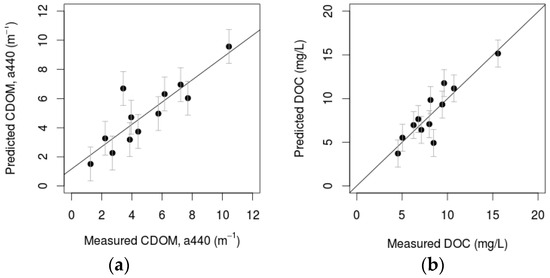 (a) Relationship between predicted CDOM at 440 nm (m−1) and measured CDOM at 440 nm (m−1) (CDOMpredicted = 1.15 + 0.76 × CDOMmeasured, R2 = 0.76, p-value < 0.001, RMSE = 1.2). (b) Relationship between predicted DOC in mg/L and measured DOC in mg/L (DOCpredicted = 0.02 + 0.99 × DOCmeasured, R2 = 0.79, p-value < 0.001, RMSE = 1.4).