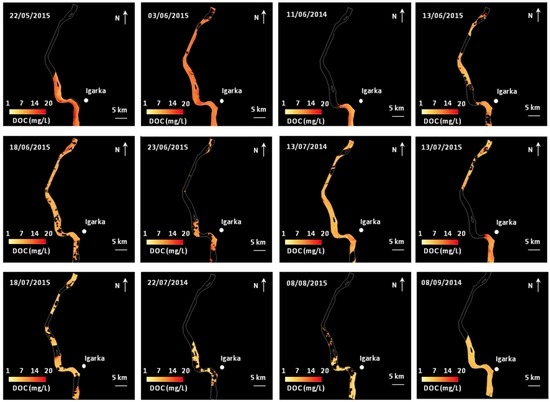 In our case, this procedure was used to predict DOC concentrations at each acquisition date. The single observation selected for validation corresponds to the satellite scene for which the map was derived. Then, we repeated the process until one map was predicted for each date available in our sample set (i.e., 12 times). The maps were produced on the maximum available river channel extent in the ST5 scenes (60 km north-south). The dates were also reorganized according to a theoretical open-water season (i.e., combined 2014 and 2015) to illustrate the potential of high-temporal remote sensing data to map seasonal DOC fluxes.