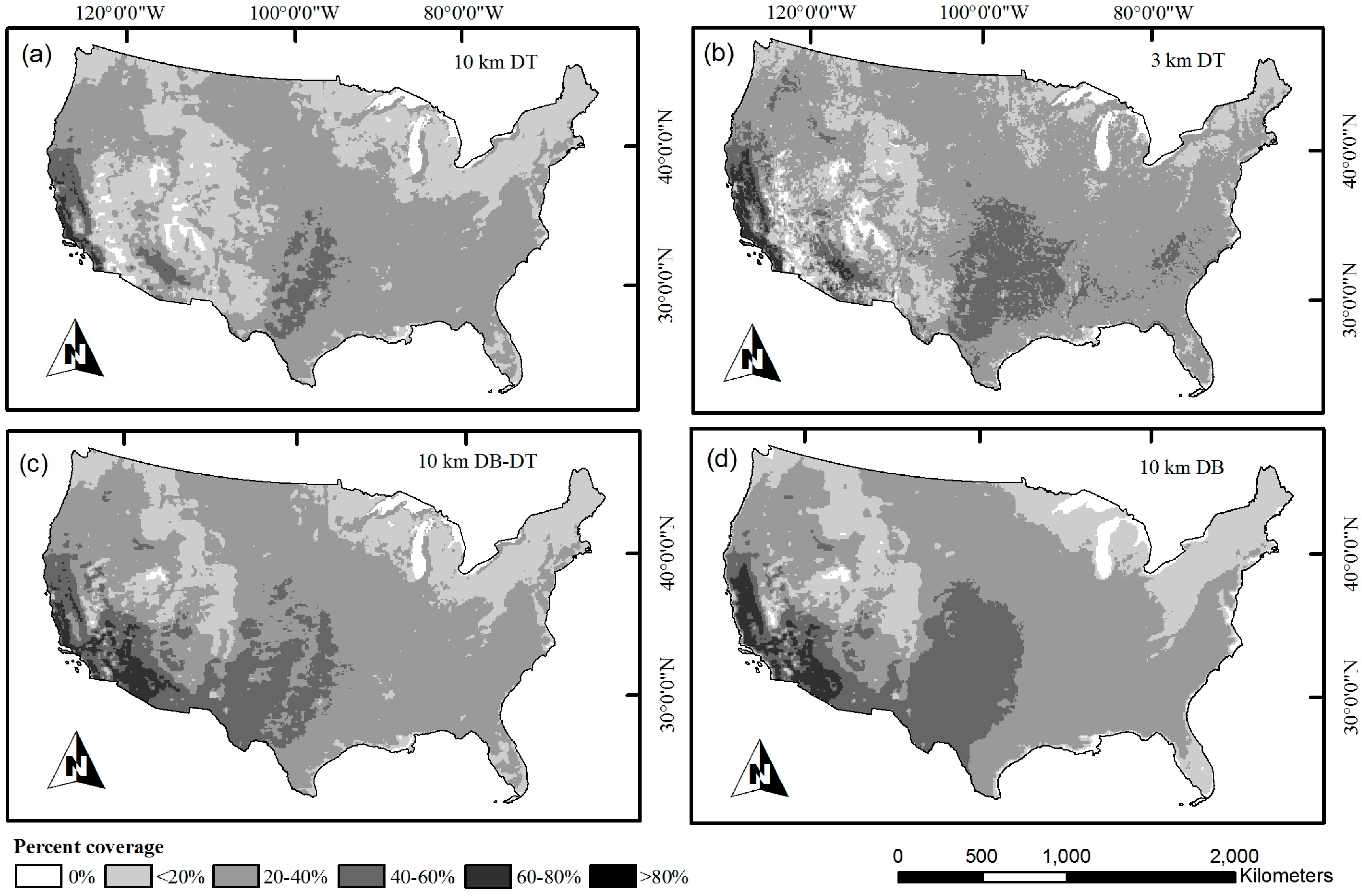Mean coverage statistics for high confidence AOD retrievals in the CONUS for 10 km DT (a); 3 km DT (b); 10 km DB-DT (c); and 10 km DB (d). Coverage is calculated as the percentage of days between 1 January 2004 and 31 December 2013 with a valid MODIS retrieval from Aqua.