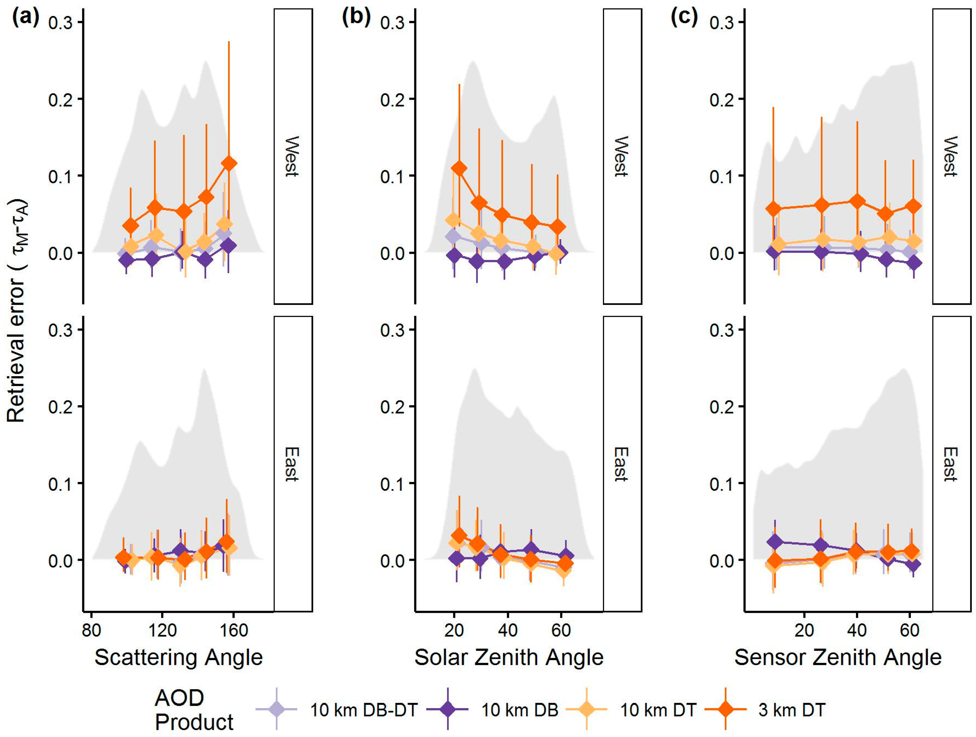 The dependence of AOD retrieval error and distributions of values for scattering angle (a); solar zenith angle (b); and sensor zenith angle (c). Median error (points) and the IQR (vertical line ranges from 25th to 75th percentile) is shown within quintiles. The distribution of values is shown in the background in gray and represents proportional frequency, where 0.25 on the y-axis represents the most frequent value in the category.