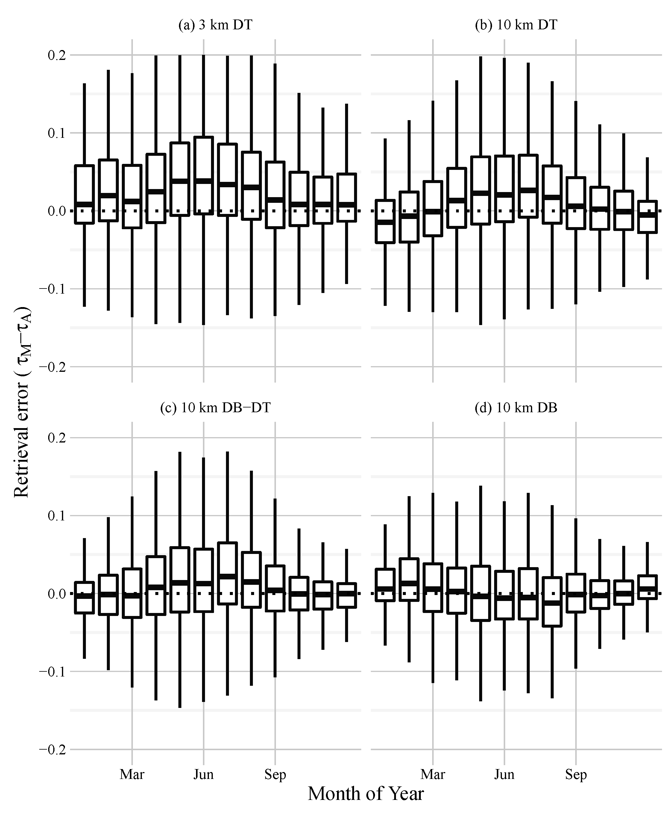 Boxplot showing the distribution of retrieval errors in MODIS AOD relative to AERONET, for each month of the year, for 3 km DT (a); 10 km DT (b); 10 km DB-DT (c); and 10 km DB (d). For each box, the midline represents the median, upper, and lower hinges represent the 25th and 75th percentiles, whiskers extend out to 5th and 95th percentiles.