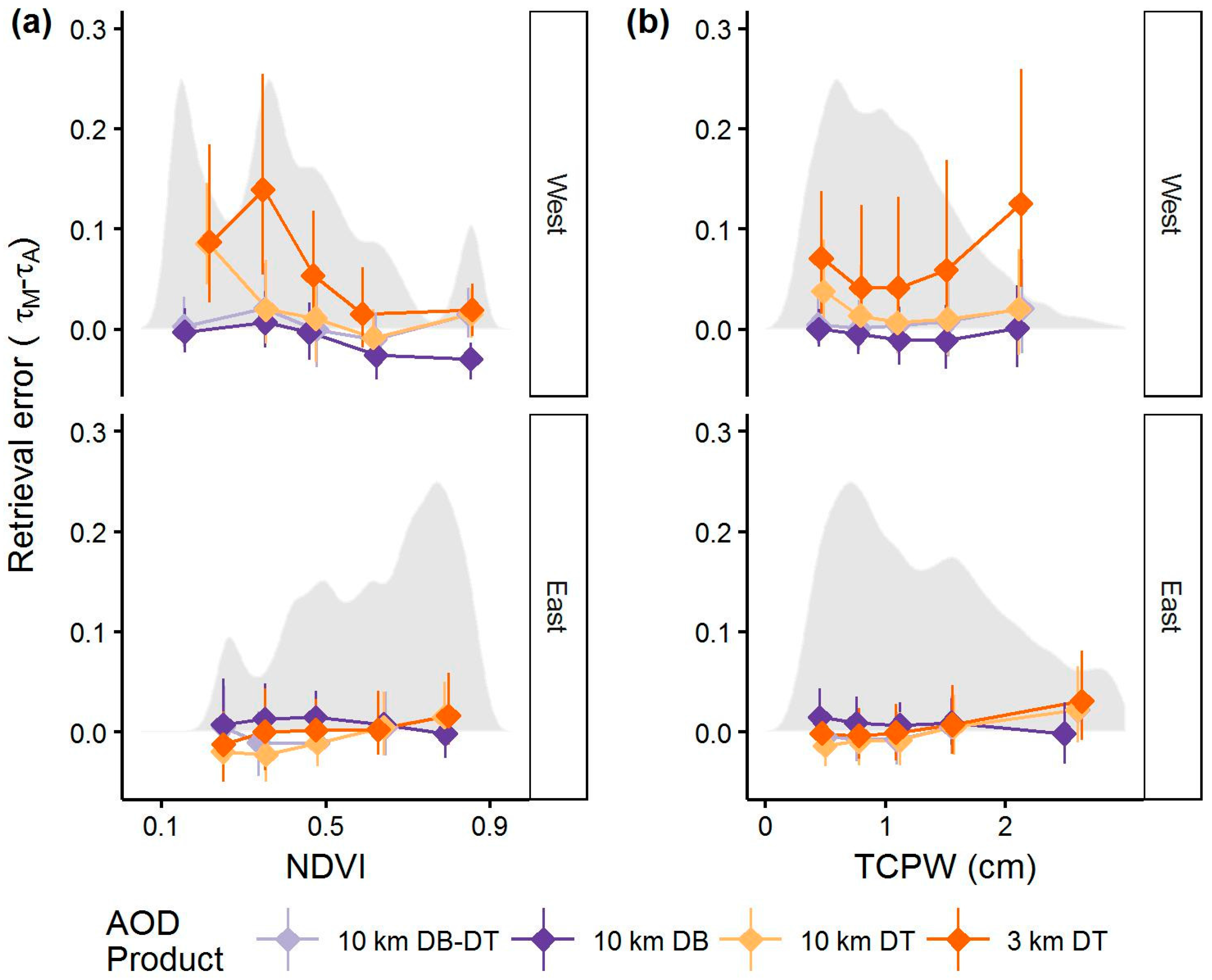 Dependence of AOD retrieval errors and distributions of values in QAC 3 MODIS AOD for NDVI (a) and TCPW (b). Median AOD retrieval error (dots) and the IQR (vertical line ranges from 25th percentile to 75th) is shown within quintiles of NDVI, and total column precipitable water. The density distribution of values is shown in the background in gray and represents proportional frequency, where 0.25 on the y-axis represents the most frequent value in the category.