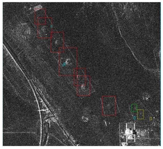 As discussed previously, the coordinates from our ground survey were quite good, but there are still shifts and errors; we will analyze these sources of uncertainty in detail in Section 4. After transforming the coordinates in the radar coordinate system based on the Range-Doppler model using the height information from the GPS measurements, and including the dry-atmosphere path delay information from the TerraSAR-X headers (see []), we marked Saka kurgans with a red rectangle, Scythian kurgans with a green rectangle, ogradkas in purple, undatable mounds in yellow and all other objects in cyan.
