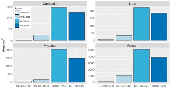Comparison of the estimated urban built-up area in Cambodia, Laos, Myanmar and Vietnam among different coarse resolution products. GLOBC-300 is the 300-m resolution the GlobCover land cover in 2009 by the European Space Agency [18]; IMPSA-100 is the 1000-m resolution global impervious surface area in 2010, which was converted to urban built-up by applying a 20% threshold [16,19]; MODIS-500 is the 500-m resolution global land cover developed from MODIS images in 2010 [13,17] and MODIS-250 is based on the statistics from the 250-m resolution urban built-up area developed with MODIS images in 2010 [11,20].