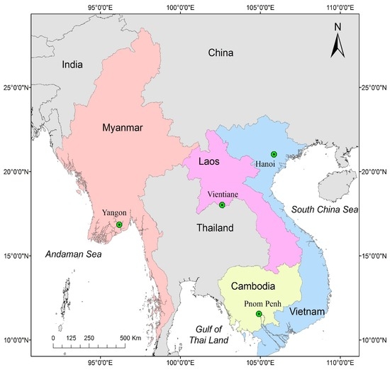 Our study area focused on the four countries that are in economic transition in Southeast Asia: Cambodia, Laos, Myanmar and Vietnam (Figure 2). In 2010, the four countries had a total population of over 159.2 million and a total area of over 1.4 million km2. These countries started their institutional transitions with various degrees of policy support and at different times [39,40]. Vietnam formally launched its economic reform in 1979 and has maintained a high economic growth since then [41]. Laos launched the New Economic Mechanism (NEM) in 1986 to shift toward a market economy, considerably improving its macroeconomic situation. In Cambodia, the transition took place in the late 1980s. Myanmar started its economic liberalization in the 1990s, but the authoritarian rule by the military did not end until 2011. When compared to the other three countries prior to 2010, Myanmar’s transition was less efficient and had been delayed. Four dominant cities (i.e., Hanoi in Vietnam, Phnom Penh in Cambodia, Vientiane in Laos and Yangon in Myanmar) were used in an accuracy assessment.