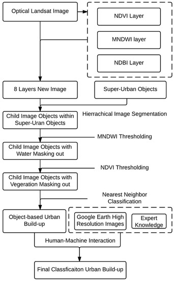 Flowchart for urban built-up classification that integrates the object-based classification and the knowledge-based manual corrections. NDVI is the normalized difference vegetation index; MNDWI is the modified normalized difference water index; and NDBI is the normalized difference built-up index.