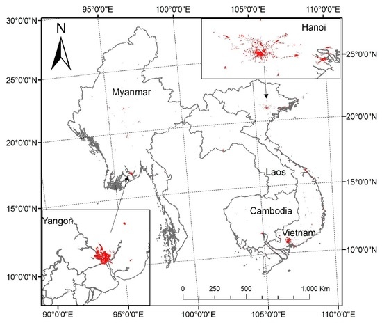 Southeast Asia is currently one of the fastest urbanizing regions in the world [11], with rapid urbanization occurring particularly in countries under transitional economies (e.g., Cambodia, Laos, Myanmar and Vietnam). These countries have experienced major shifts from centralized and planned economies to free market economies since the 1980s, which were characterized by liberalization, macroeconomic stabilization, restructuring and privatization and legal and institutional reforms. Once the least developed countries in Asia, economic transition unleashed the forces for urbanization. The percentage of urban population jumped from 9%, 12%, 24% and 19% in 1980 to 20%, 32%, 33% and 35% in 2012 in Cambodia, Laos, Myanmar and Vietnam, respectively. Despite the importance of understanding the spatiotemporal changes of urban built-up land, as well as the causes and consequences of the urbanization, only a few studies have assessed the spatial extent and dynamics of urban built-up areas in Southeast Asian countries [11,12].