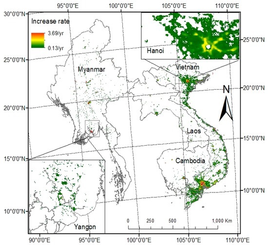 Most areas around urban built-up land within the four countries significantly increased in NTL brightness (Figure 7). The fastest increasing trends were observed in large urban clusters, such as Hanoi, Ho Chi Minh City, Vientiane, Phnom Penh and Naypyidaw. In terms of spatial distribution, the largest areas of increased NTL brightness were observed in these same large metropolitan areas, as well as the coastal cities of Vietnam. While 25.4% of the total area of Vietnam had experienced an increase in NTL brightness, only 1.6%, 1.8% and 1.9% of the total area of Laos, Myanmar and Cambodia, respectively, had a significant increase in NTL brightness.