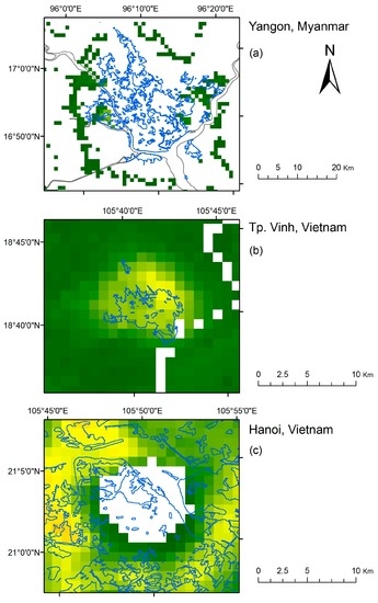 - Pham, H.M.; Yamaguchi, Y. Urban growth and change analysis using remote sensing and spatial metrics from 1975 to 2003 for Hanoi, Vietnam. Int. J. Remote Sens. 2011, 32, 1901–1915. [Google Scholar] [CrossRef]