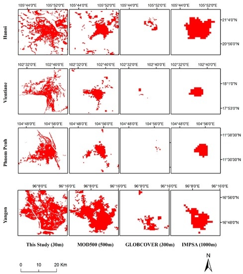 A coarse resolution with low accuracy results in a low level of agreement among the estimates of total urban built-up areas in Southeast Asian countries (Figure 1). Consequently, there is a demand for a new product with improved spatial resolution and accuracy. Mapping land use and land cover (LULC) with 30-m resolution Landsat TM/enhanced TM (ETM+) can provide more detailed and accurate spatial information of built-up surfaces in an urban landscape than coarse resolution images [33,34]. It is important for local or regional planning and management to continue efforts using this 30-m (or finer) resolution. Recent advances in data accessibility and high-performance computing capacity make it feasible to use Landsat-like data for regional/global LULC mapping, such as the delivery of the global LULC at 30 m for the public. Examples include Finer Resolution Observation and Monitoring of Global Land Cover (FROM-GLC) [35] and the global land cover (GLC-30) [33], which provide more accurate surface cover fractions for land process models and fill the data/knowledge gaps that are needed by developing countries in Africa, Asia and South America, where limited LULC products at the national level exist. However, the accuracy of the impervious area class in FROM-GLC is too low (<35%) for practical applications. While the GLC-30 achieved higher accuracy (>80%), it does not include urban built-up/land classes. As a result, reliable 30-m resolution urban built-up maps are not available from global datasets. From local and regional studies focusing on Southeast Asia, a few case studies on urban LULC based on 30-m resolution Landsat TM/ETM+ [36,37,38] for individual cities exist but none had developed national urban built-up maps for countries with a transitional economy.