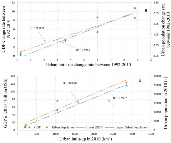 Relationship between urban built-up areas and socioeconomic data of GDP and population. The change rate between 1992 and 2010 was calculated as the net increase divided by the base number in 1992. All GDP and population data were acquired from the World Bank [76], except GDP data for Myanmar were acquired from its national statistics collected by our local collaborators.