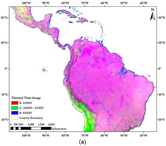 False color composite of thermal time metrics for tropical America (a) and the Southern Cone (b). Labels show urban identification numbers as presented in Table S1.
