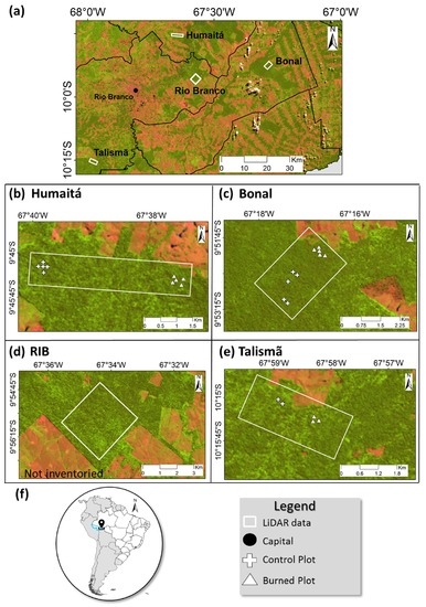 (a) the composition map (Red/Green/Blue = Band 5/4/3) of Landsat-5 Thematic Mapper (TM) images of the study area; (b) Humaitá; (c) Bonal; (d) Rio Branco; (e) Talismã; and (f) map of the studied region. The white polygons (in b–e) represent the LiDAR covered. The blue polygons are the plots not affected by fire and the red polygons are the plots affected by fire.