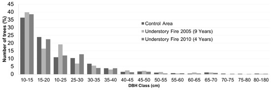 Analyzing the percentage of trees per hectare by diameter class, we observed an inverted-J pattern in CA. This pattern is expected for uneven-aged stands and natural forests where a large number of trees populate the smaller diameter classes, following an exponential decrease in the number of trees with larger diameters [59] (Figure 2). Burned sites, BA-2005 (75%) and BA-2010 (77%), however, had a larger percent of trees than CA (71%) populating the smaller diameter class (10 ≤ DBH ≤ 25 cm). Conversely, both BA-2005 (15%) and BA-2010 (16%) had a lower number of trees in the 25 < DBH ≤ 40 cm size class in comparison to CA (21%). The percentage of trees with DBH > 40 cm for CA, BA-2005 and BA-2010 were 8%, 9% and 7%, respectively.