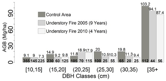 Aboveground biomass (AGB) in Mg·ha−1 for Control Area (CA) (dark gray), Burned Areas (BA)-2005 (gray) and BA-2010 (light gray). Above the bars are the accumulated AGB and inside the bars are total trees in each diameter at breast height (DBH) class.