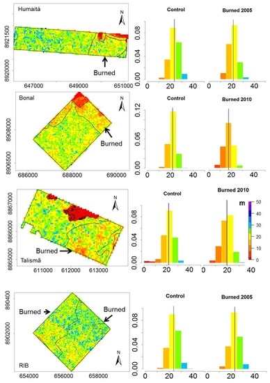 Analyzing the LiDAR-derived height values, we found significant differences between the height distribution of CA and BA-2005, CA and BA-2010, and BA-2005 and BA-2010 (p-value < 0.05). For burned areas in 2005, the average height was 23.54 m (control) and 23.66 m (burned) for Humaitá and 21.36 m (control) and 23.11 m (burned) for RIB . For burned areas in 2010, the average height was 21.93 m (control) and 21.73 m (burned) for Bonal and 17.49 m (control) and 19.55 m (burned) for Talismã. Figure 4 shows the maps of height from LiDAR resampled to a regular 50 m × 50 m grid.
