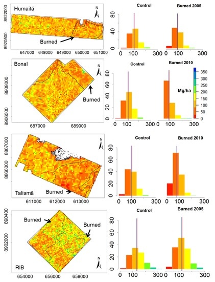 Differently from field-based measurements, we found significant differences between the distribution of AGB of CA and BA-2005, CA and BA-2010, and BA-2005 and BA-2010 (p-value < 0.05) , when analyzing the whole landscape affected by fire using LiDAR information. For burned areas in 2005, we observed a biomass loss of 8.99 Mg·ha−1 for RIB (6.71% decrease) and 15.07 Mg·ha−1 for Humaitá (13.66% decrease). For burned areas in 2010, we found a biomass loss of 20.39 Mg·ha−1 for Bonal (17.89% decrease) and 23.47 Mg·ha−1 for Talismã (22.69% decrease). The total forest biomass loss was 12,505.02 Mg for the four studies areas, with an average loss of 2890 Mg for sites burned in 2005 and 5463.2 Mg for sites burned in 2010, and with an average loss of 4176.6 Mg. Figure 5 shows the maps of AGB from LiDAR resampled to a regular 50 m × 50 m grid. Table 2 presents the statistics from estimated height and AGB by LiDAR data for each area.