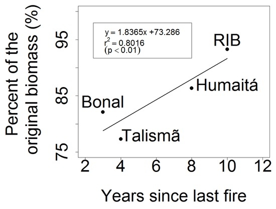 Exploring the relationship showing changes in the original biomass as a function of years since the last fire. It is interesting to note that if the recovery process followed a linear pattern ( = 0.95, p < 0.01), burned forests would recover its original biomass at a rate of 1.84% a year (Figure 6) based on the slope of the regression. Moreover, the loss of biomass of the studied forests immediately after fire occurrence is likely to correspond to 27% of the original biomass according to the intercept of the regression.