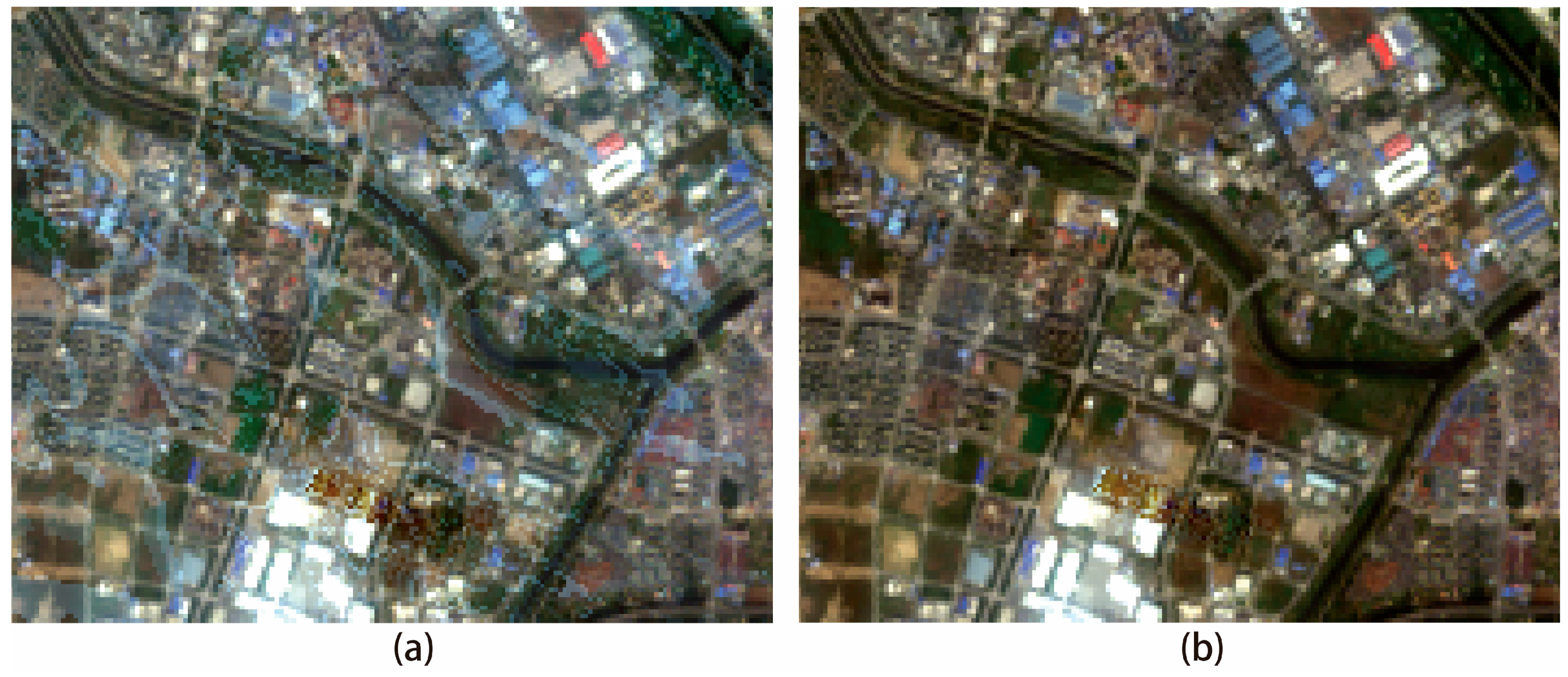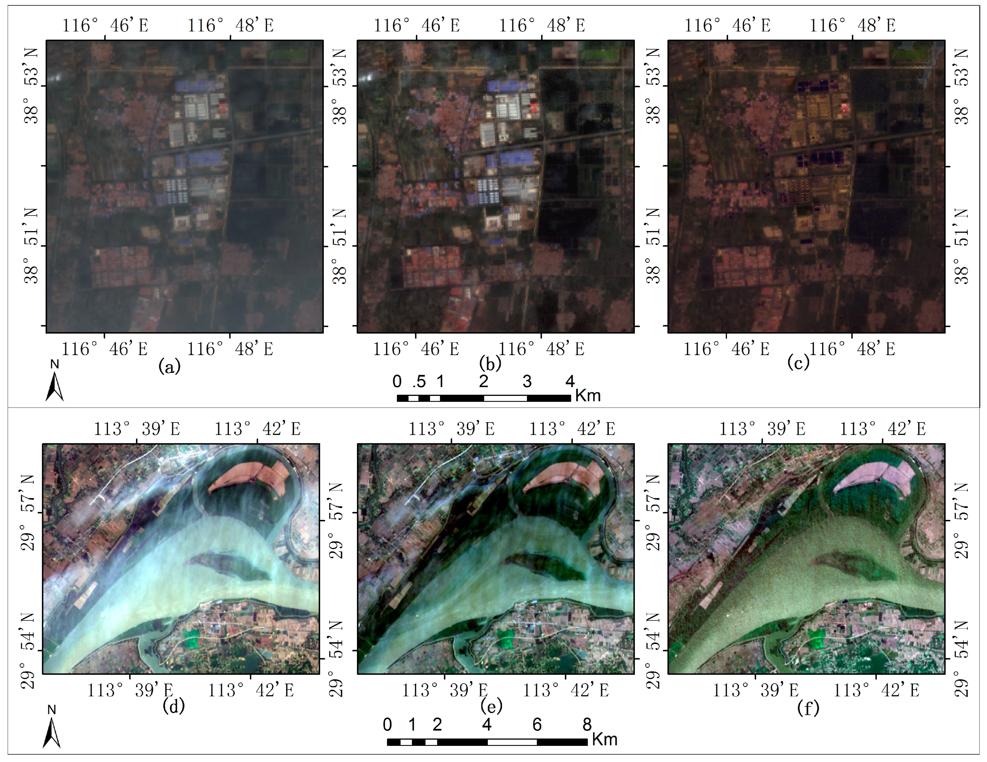 Figure 8 shows the results of haze removal on GF-2 images with a spatial resolution of 0.8 m after fusing full-color and multi-spectral bands. The image of