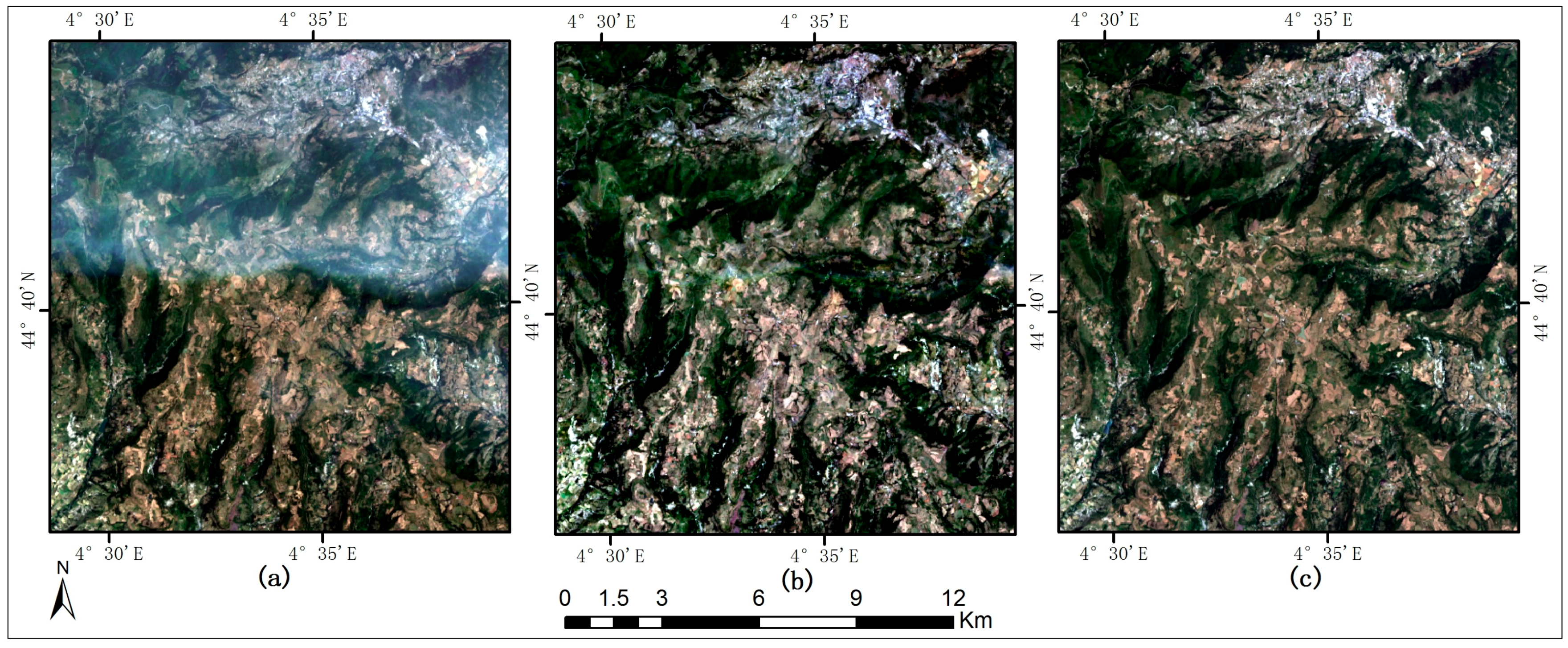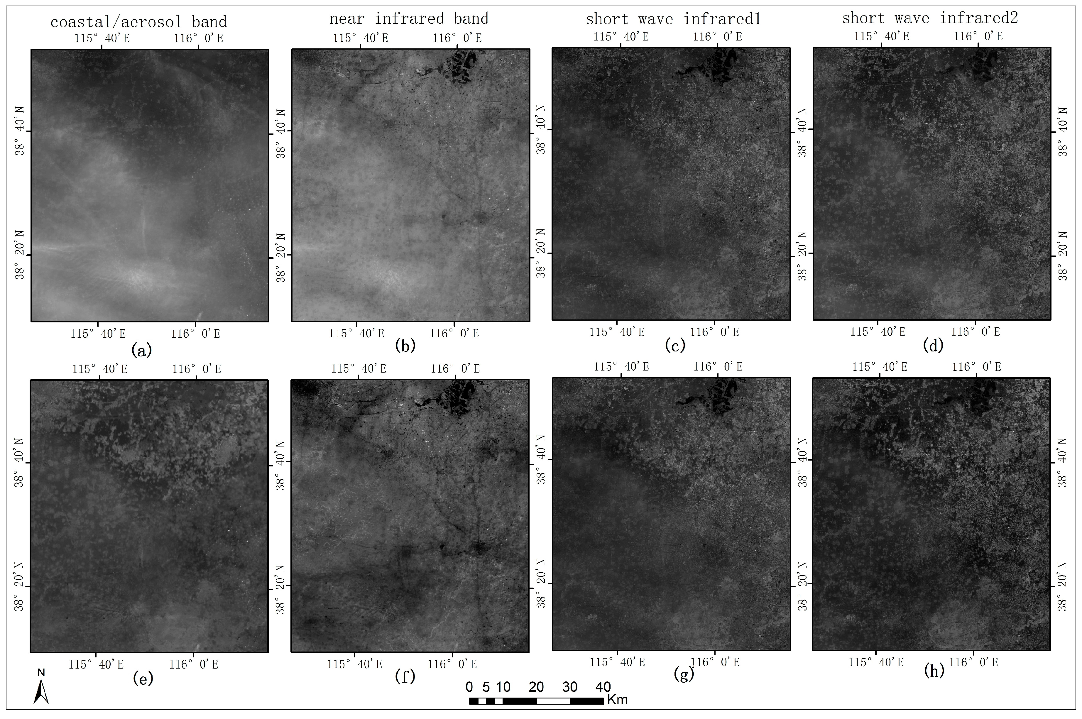 Figure 5 shows the result of haze removal of Landsat 8 OLI data, whose parameters are listed in