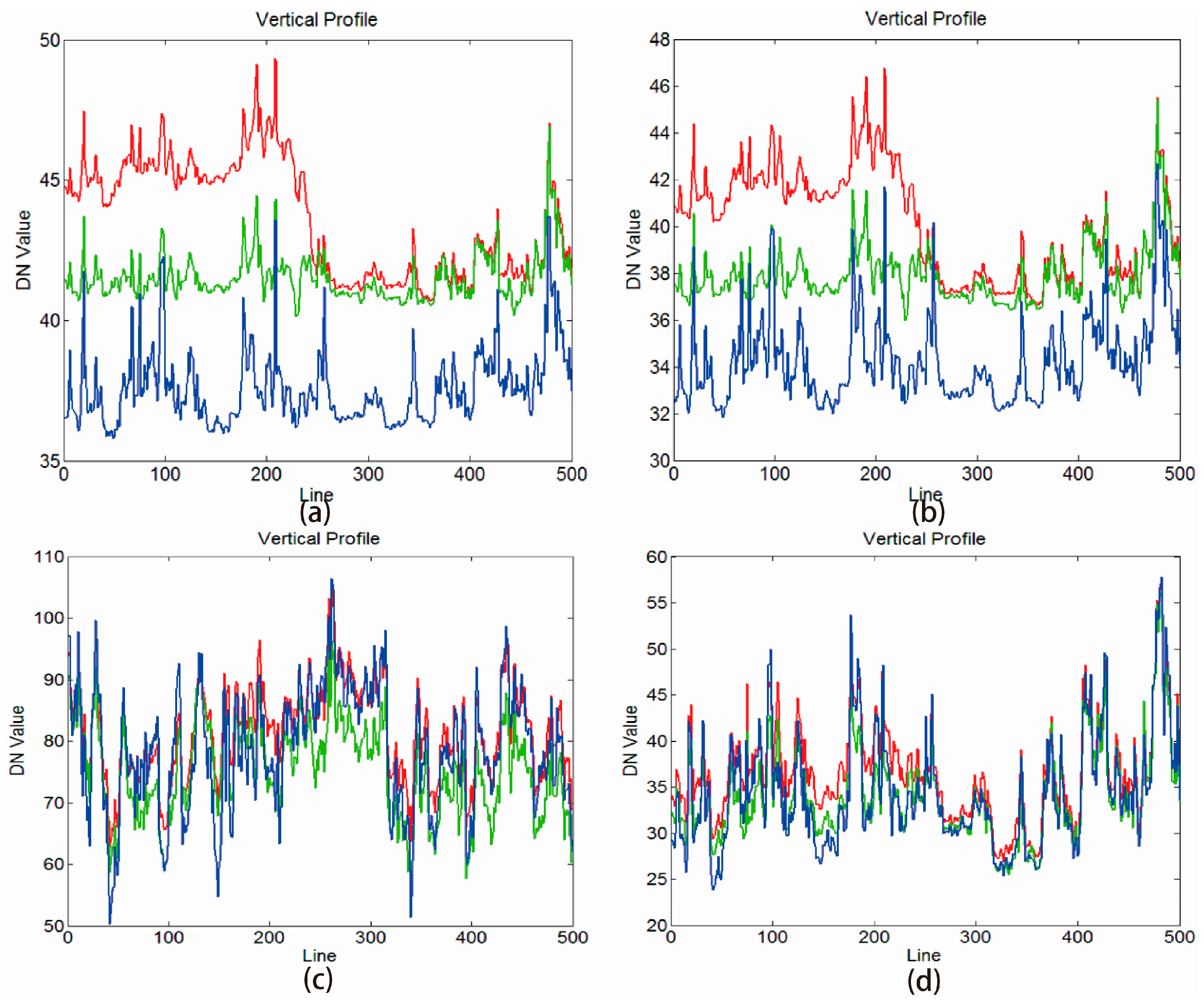 10] proposed a haze optimized transformation (HOT) method for haze evaluation, assuming that digital numbers (DNs) of band red and blue will be highly correlated for pixels within the clearest portions of a scene and that this relationship holds for all surface classes. HOT combined with dark object subtraction (DOS) [