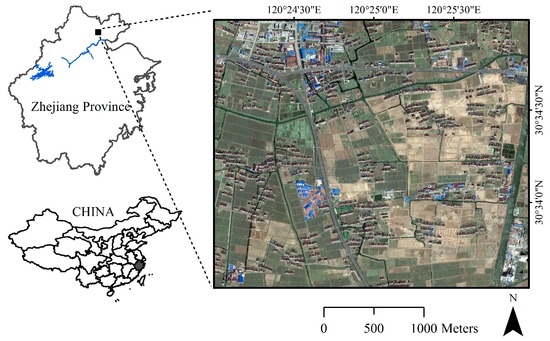 In this study, we selected a typical rural region in the Yangtze River Delta. The study site includes three villages located in Chongfu Town and Shimeng Town, Tongxiang County, Zhejiang Province (120°24′45″E, 30°34′00″W, Figure 1). The region has a subtropical climate with a clear monsoonal character and four distinct seasons. The annual average temperature and total annual precipitation are approximately 16.5 °C and 1246.7 mm, respectively [26]. Due to the excellent climate and soil conditions, various crops are suitable to grow in study area. This place was the traditional main grain producing area of China for millennia. Nevertheless, massive scale industrialization and rapid development have taken place since the 1990s. This study site also includes Economic and Technological Development Zones (ETDZs) of Shimeng Town, which have over 60 companies and beyond 5000 employees [26]. Therefore, this area represents a typical landscape of township economic prosperity and development in a rural region of Eastern China.