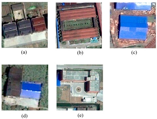 Example of artificial cover types: (a) Clay rooftops and grain-sunning ground of settlement; (b) Clay rooftops of industry; (c) Metal rooftops of factory; (d) Metal rooftops of settlement; and (e) Concrete rooftops and roads in factory.