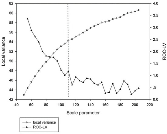 Usually, optimum segmentation parameters were obtained by subjective manual trial-and-error test. To make our framework operational and portable, an objective method named Estimation of Scale Parameter, i.e., ESP2 tool [32], was used to identify the statistically most suitable scale parameter for segmentation algorithm. ESP tool iteratively generates image-objects at multiple scale levels in fixed step size and calculates the local variance (LV) in each scale. The rates of change of LV (ROC-LV) were plotted against the corresponding scale in Figure 4. Based on the plot diagram, the peaks of the curve indicated appropriate scale parameter for segmentation [33,34,35]. The scale of 110 appeared promising as the first break in ROC-LV curve after continuous and abrupt decay. Dotted vertical lines indicated optimal scale parameters in Figure 4. As a result, we set segmentation scale as 110.