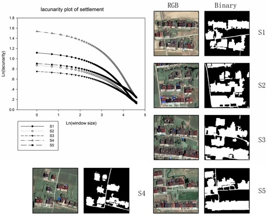 The relationship between window-size and lacunarity was analyzed based on 200 m× 200 m examples. Figure 5 illustrated how the lacunarity plots vary with increasing window scale in both settlement and industry area.